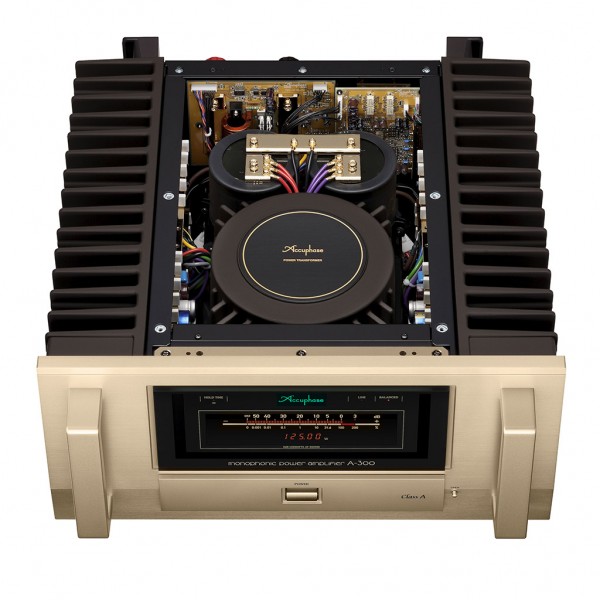 Amplificatore finale di potenza monofonico a stato solido in pura Classe A completamente bilanciato, top di gamma Accuphase - potenza 125 Watt su 8 Ohm, 250 Watt su 4 Ohm, 500 Watt su 2 Ohm, 1000 Watt su 1 Ohm - possibilità di configurazione a ponte con due A-300, per una potenza totale di 500 Watt su 8 Ohm, 1000 Watt su 4 Ohm e 2000 Watt su 2 Ohm - due distinte unità di amplificazione bilanciate pilotate in parallelo, con 20 MOS-FET di potenza ad alta corrente (33 A) in configurazione push-pull - stadio di amplificazione con tecnologia Double MCS+ (Multiple Circuit Summing-up) a doppia circuitazione parallela e stadio d'uscita Current Feedback a bassissima impedenza dotato di tecnologia Balanced Remote Sensing, con strabiliante fattore di smorzamento (Damping Factor) garantito superiore a 1000 (misurato strumentalmente fino a 2000) - stadio d'alimentazione con imponente trasformatore toroidale custom ad alta efficienza e condensatori di filtro d'elevata capacità (2x 100.000 uF) - guadagno variabile a 4 posizioni (Max/-3/-6/-12 dB) - circuito di protezione a semiconduttori MOS-FET a bassissima resistenza e certificati per altissime tensioni d'esercizio, coadiuvati da un inedito circuito di rilevamento di sovraccarichi e cortocircuiti e da un sensore di temperatura direttamente montato sui dissipatori, capace di arrestare in tempo reale l'erogazione di corrente in caso di anomalie - circuiti stampati in vetro e resina fluorocarbonica a bassa costante dielettrica e bassissima perdita - Output Power Meter illuminato dotato di barre grafiche dinamiche logaritmiche a LED per la potenza calcolata sulla tensione in uscita e visualizzazione digitale della potenza effettiva espressa in Watt - piedi isolanti "High Carbon" con elevate proprietà di smorzamento - ingressi bilanciati XLR e sbilanciati RCA - selettore di fase per invertire i pin 2 e 3 della connessione bilanciata XLR - doppio set di terminali d'uscita per diffusori sovradimensionati - distorsione armonica totale (THD) 0,03% da 4 a 16 Ohm - distorsione di intermodulazione 0,01% - rapporto segnale/rumore (S/N Ratio) fino a 135 dB - dimensioni (L x A x P) 465 x 240 x 515 mm - Peso 46 Kg